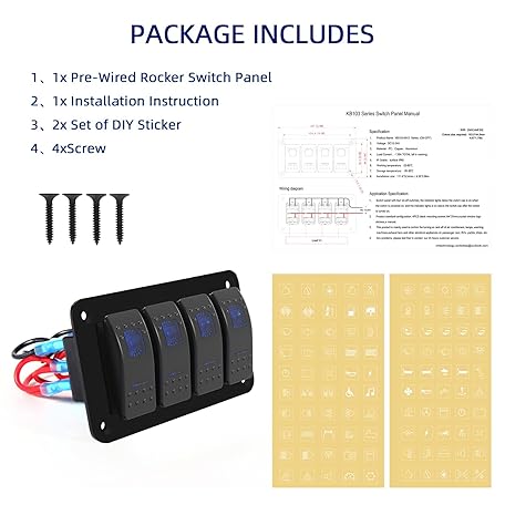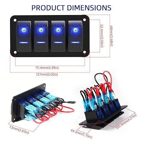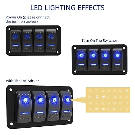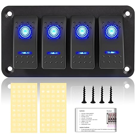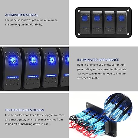 Thông tin sản phẩm Waterproof 4 Gang Aluminum Toggle Switch Panel, 12V/24V Rocker Switch Panel On-Off Car Boat Switch, Blue LED Switch Panel for Marine Boat Automotive Car RV Truck Vehicles