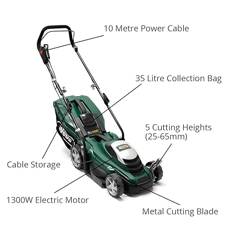 Thông tin sản phẩm Webb Classic WEER33 Electric Rotary Lawnmower with 5 Cutting Heights, 33cm Cutting Width and 35L Collection Bag - Voted Best Buy Budget Mower by BBC Gardener’s World - 3 Year Guarantee
