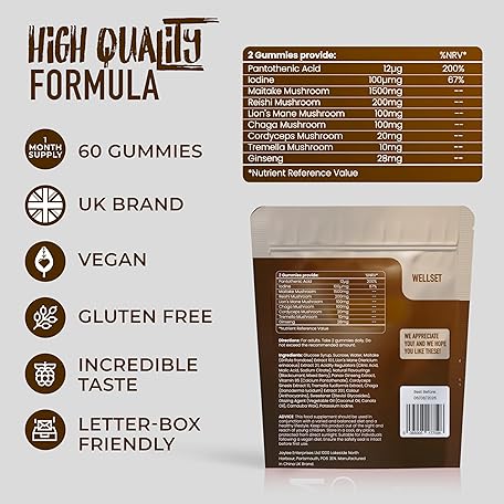 Sản phẩm WELLSET Mushroom Gummies 8-in-1 Complex | Lion's Mane, Reishi, Cordyceps, Chaga, Maitake & Tremella - Natural Flavour | 60 Vegan Gummies | Mushroom Supplement for Focus, Energy & Immunity đang được bán với giá ưu đãi là $14.6278 tại nước Anh.