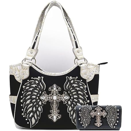 Western Style Rhinestone Cross Studded Laser Cut Wings Tooled Leather Purse Women Handbags Country Shoulder Bag Wallet Set, Black/Silver Set, L