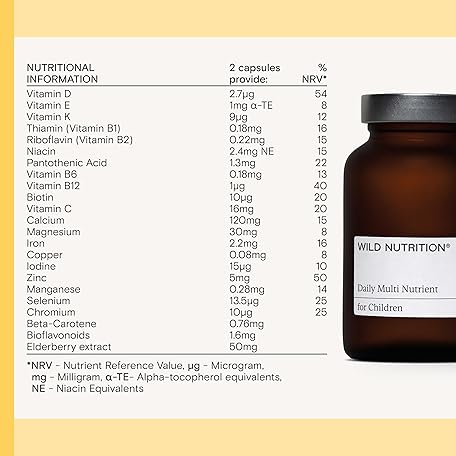 Thông tin sản phẩm WILD NUTRITION Food-Grown® Kids Daily Multi Nutrient | Kids Multivitamin with B Vitamins, Magnesium, Zinc, Vitamin D, and More to Support Immunity, Bones, and Cognitive Development | 60 Capsules