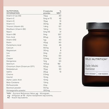 Thông tin sản phẩm WILD NUTRITION Food-Grown® Women's Daily Multi Nutrient | to Support Hormonal Balance, Fatigue, and Mental Resilience | Vegetarian Multivitamins for Women | 60 Capsules (60 Capsule, Women Multi)