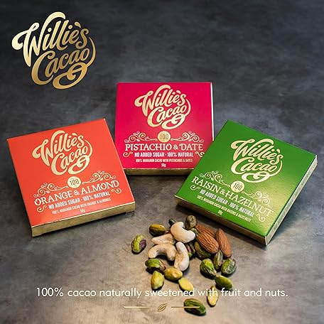 Sản phẩm Willie's Cacao 100% Cocoa with Pistachio & Date - No Added Sugar Chocolate bar - 50g x 12 - Naturally sweetened with fruit and nuts - Vegan - Artisan made đang được bán với giá ưu đãi là $45.3549 tại nước Anh.