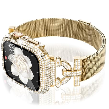WINGLE Milanese Loop for Gold Apple Watch Bands Series 11 10 46mm Women Slim Magnetic Metal Mesh Band with Bling Glitter Case Screen Protector Dressy Apple Watch Band iWatch Strap for Woman