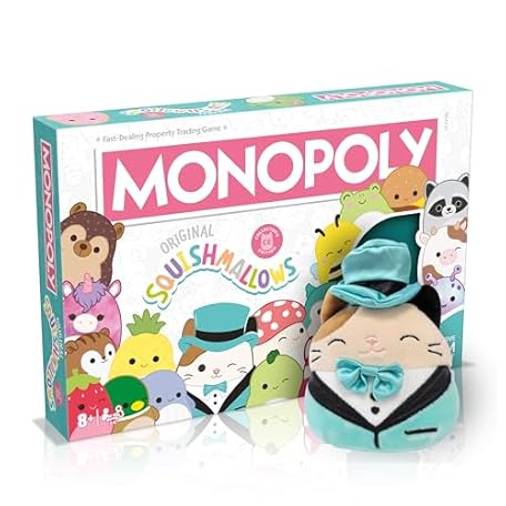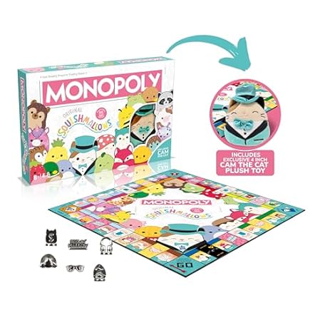 Thông tin sản phẩm Winning Moves Squishmallows Monopoly Board Game Collectors Edition, Play with Fifi the Fox, Rosie the pig and Brock the Bulldog, includes an exclusive 4" Cam the Cat plush, great gift for ages 8+