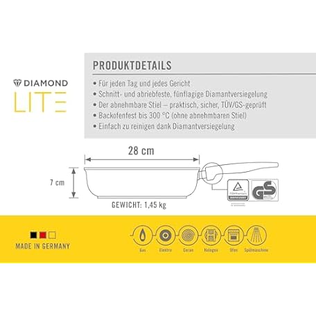 Thông tin sản phẩm Woll Diamond Lite high-rimmed pan, diameter 28 cm, 7 cm high, with removable handle, suitable for ceramic, gas, electric, halogen, not suitable for induction, cast aluminum pan, ovenproof, anthracite
