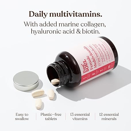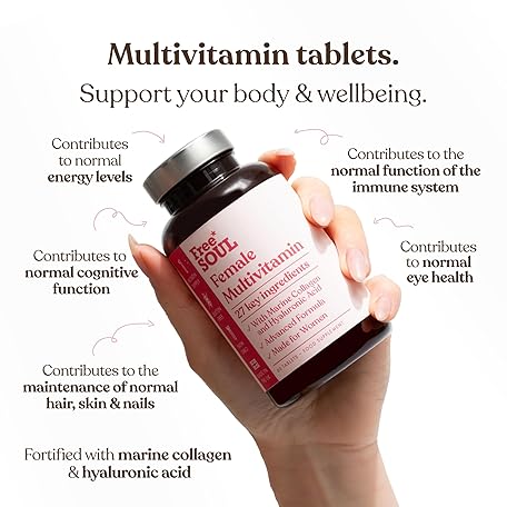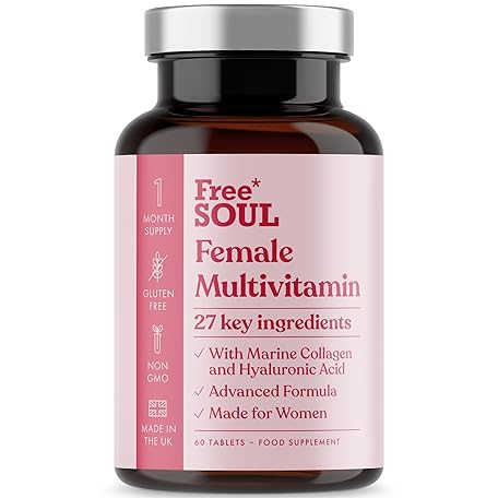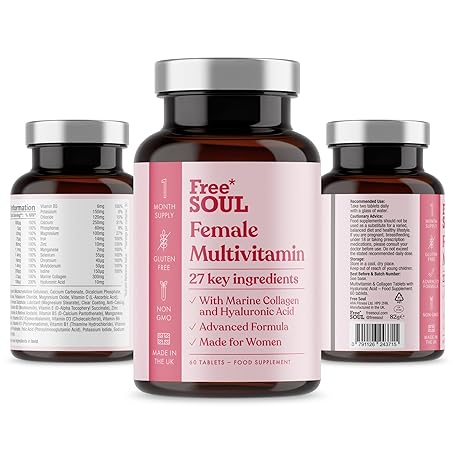 Sản phẩm Women's Multivitamins & Minerals with Marine Collagen & Hyaluronic Acid | 27 Essential Vitamins, Minerals, & Botanicals | Gluten-Free & No Synthetic Fillers or Binders | 60 Tablets | Free Soul đang được bán với giá ưu đãi là $18.6172 tại nước Anh.