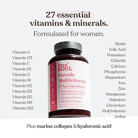 Thông tin sản phẩm Women's Multivitamins & Minerals with Marine Collagen & Hyaluronic Acid | 27 Essential Vitamins, Minerals, & Botanicals | Gluten-Free & No Synthetic Fillers or Binders | 60 Tablets | Free Soul