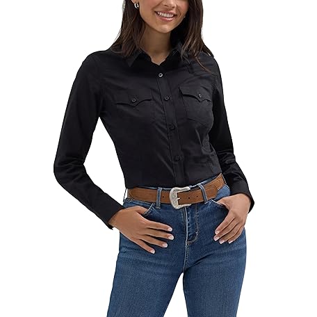 Women's Retro Long Sleeve Cool Blue Solid Western Shirt, Black, S