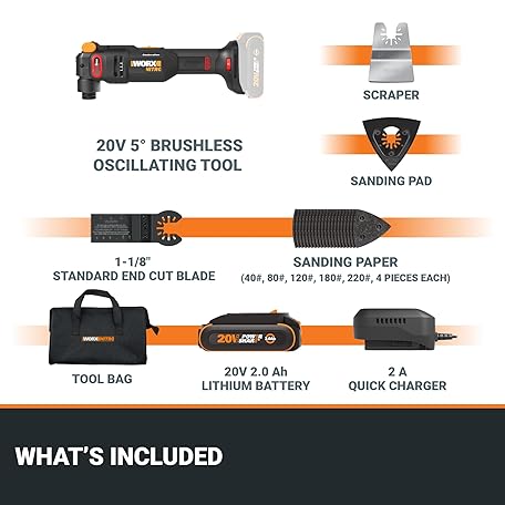 Thông tin sản phẩm Worx Nitro 20V Cordless Oscillating Multi Tool with 5° Oscillation Angle, VibraFree Technology, Slim-Body Design, 2.0 Ah Battery and Charger Included, 23 Pieces Accessories with Carrying Bag, WX698L