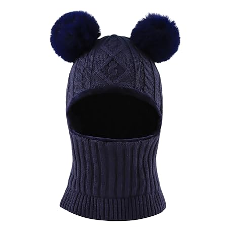 XIAOHAWANG Winter Warm Baby Hood Hats Kids Knit Earflap Caps Fleece Lining Hat Scarf for Toddler Boys Girls (Navy Pompom, M)