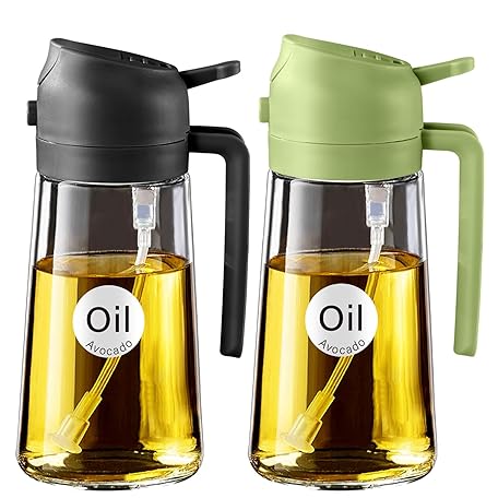 YARRAMATE 2Pcs 2-in-1 Olive Oil Sprayer Glass Bottle Dispenser, 16oz/470ml Capacity, Premium Nozzle for Cooking, Pour and Spray, Kitchen, Air Fryer, BBQ (Black & Green)
