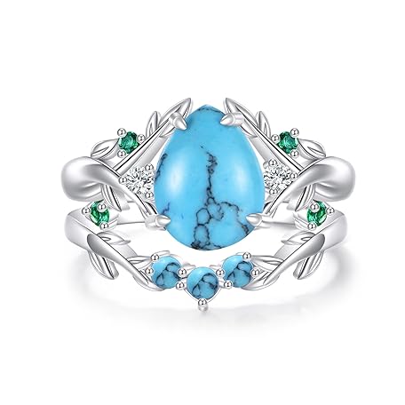 YFN 925 Sterling Silver Moss Agate/Turquoise Ring Set for Women Exquisite Leaf Engagement Wedding Promise Ring Jewelry Gift for Anniversary Birthday Valentine's Day Christmas