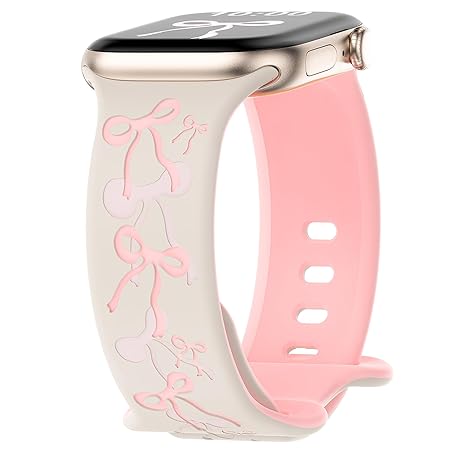 • YMHML Bow Band Compatible with Apple Watch Bands for Women 40mm 42mm 41mm 38mm 44mm 45mm 46mm 49mm, Engraved Cute Silicone Inlay Dressy Pink Ribbon Strap for iWatch Series 10 9 8 7 6 5 4 3 SE Ultra