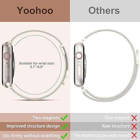Thông tin sản phẩm Yoohoo Milanese Loop for Apple Watch Straps 38mm 40mm 41mm 42mm 44mm 45mm 46mm 49mm Women Men,Strong Magnetic Clasp Adjustable Metal Bands for iWatch Series 11 10 9 8 7 6 5 4 3 2 1 Ultra SE,Starlight