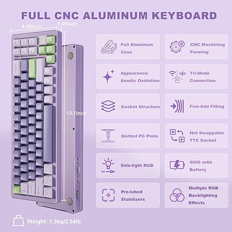 Thông tin sản phẩm YUNZII AL71 75% Mechanical Keyboard, Full Aluminum CNC, Hot-Swap Gasket, 2.4GHz Wireless BT5.0/USB-C Wired Gaming Keyboard,NKRO Programmable RGB Backlight,for Win/Mac(Purple,Crystal White Switch)