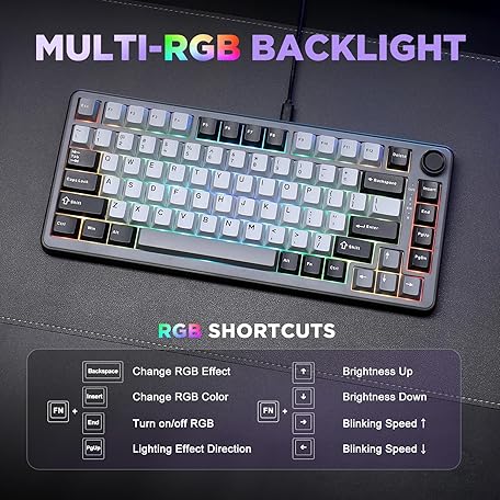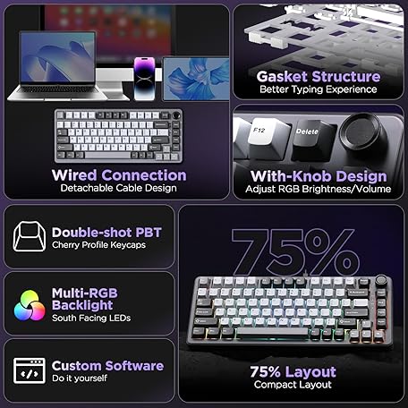 Thông tin sản phẩm YUNZII B75 Mechanical Keyboard, 75% Hot Swappable Keyboard with Knob, RGB Backlit Gasket Gaming Keyboard with Double-Shot PBT Keycaps, Cherry Profile, for WIN/MAC (dark grey, blue grey tactile)