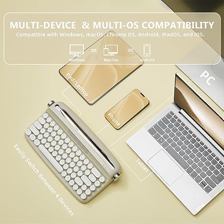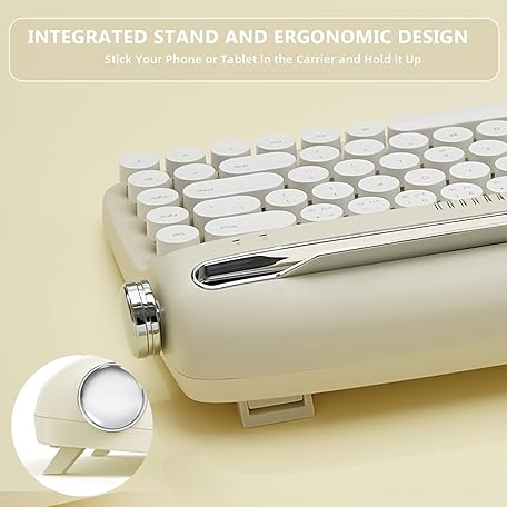 YUNZII Upgraded Wireless Typewriter Keyboard, Retro Keyboard Typewriter Style with Integrated Stand, USB-C/Bluetooth Keyboard with Cute Round Keycaps for Multi Device for Win/Mac (B307, Sand Beige)