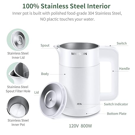 Thông tin sản phẩm 0.6L Small Electric Kettles Stainless Steel, Travel Mini Hot Water Boiler Heater, Double Wall Cool Touch Portable Teapot, Auto Shut-Off & Boil-Dry Protection, 120V/800W, 2 Year Warranty (white)