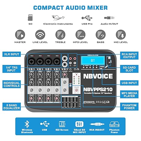 Thương hiệu NBVOICE là cái tên nổi tiếng được rất nhiều khách hàng trên thế giới chọn lựa. Với kiểu dáng đẹp mắt, sang trọng, sản phẩm 10" 600W Professional PA System with Mixer DJ Bundle, Portabel Speakers 2-Way Wireless Bluetooth Sound System with USB SD XLR 1/4" RCA inputs-Home/OutdoorParty là sự lựa chọn hoàn hảo nếu bạn đang tìm mua một món cho riêng mình.