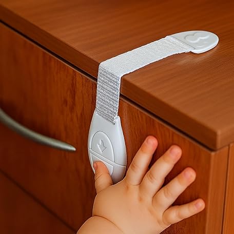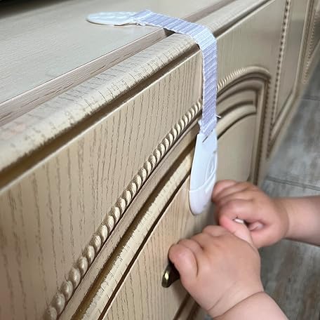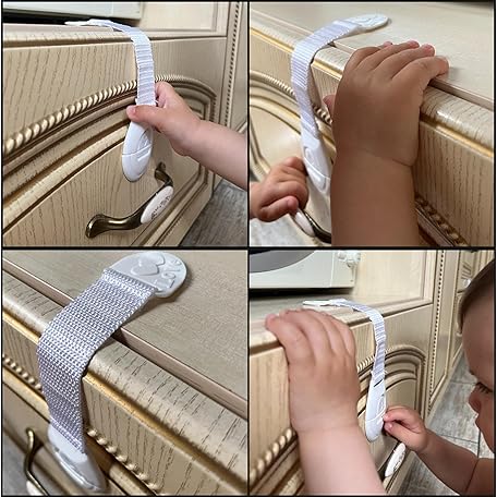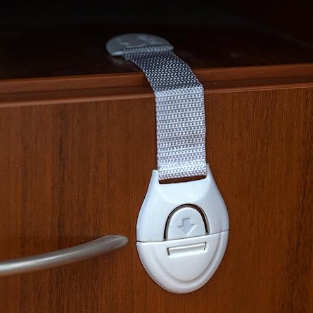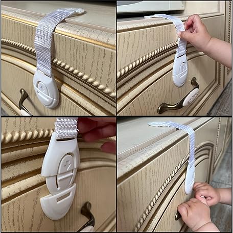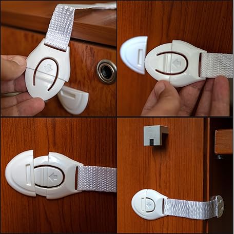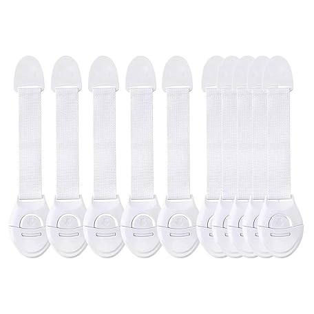 Thông tin sản phẩm 10 Pack Child Safety Cabinet Locks. Safe Quick and Easy Installation by Adhesive Tape. No Screws, No Magnets. No Drilling. Multi-Purpose for Any Furniture: Cupboards, Drawers, Also Ovens, Trash Cans.