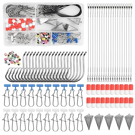 • 105PCS Surf Fishing Tackle Kit Fish Finder Rigs Saltwater Surf Fishing Rigs Live Bait Rig with Hooks Floats Sinker Slider Beads Pyramid Sinkers Leaders for Bass Beach Ocean Fishing Gear Accessories
