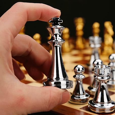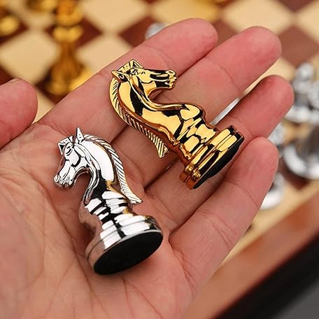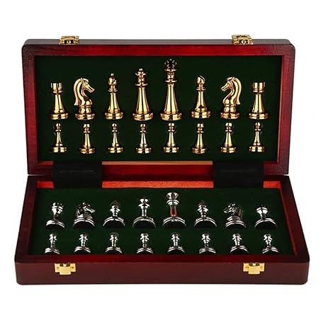 • 11Inch Large Deluxe Metal Chess Set - Portable Wooden Box with Alloy Pieces, Folding Board, Ideal for Adults