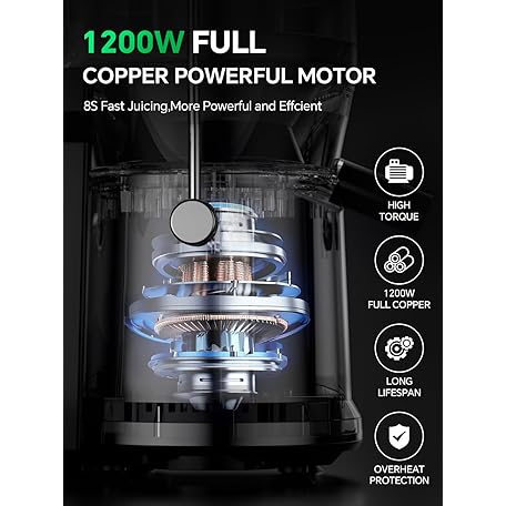 Thông tin sản phẩm 1200W Juicer Machines with 3.2" Feed Chute for Whole Fruits and Vegs, Dual Speeds Centrifugal Juice Extractor, Heavy Duty Full Copper Motor, 35oz Large Juice Jug, Easy to Clean, BPA-Free