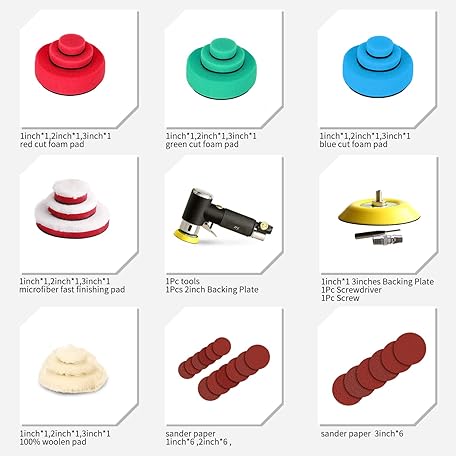 Thông tin sản phẩm 1/2/3 Inch Random Orbital Air Sander, Mini Pneumatic Sander for Auto Body Work, High Speed Air Powered Polisher with 15 Polishing Buffing Pads,18 Sandpapers