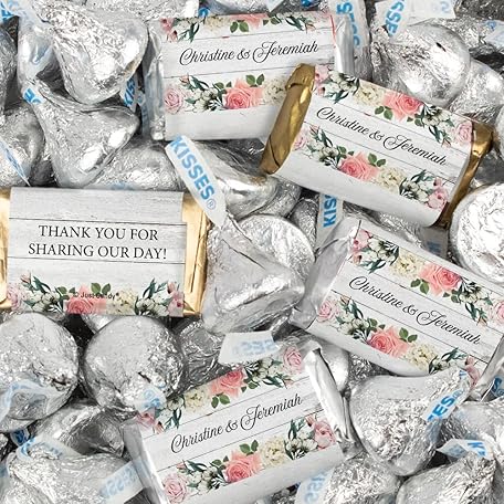 • 128 Pcs Personalized Wedding Candy Party Favors Wrapped Miniatures and Kisses (1.58 lbs) - Pink Botanicals