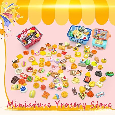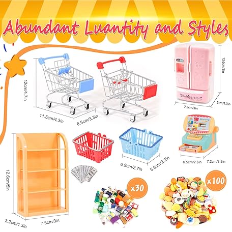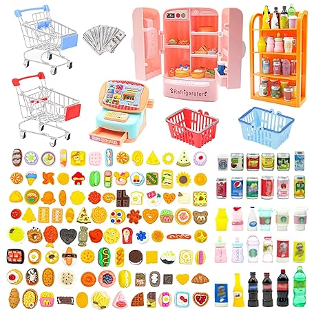 139 Pcs Mini Shopping Cart Basket Miniature Food Drink Toy Supermarket, Miniature Dollhouse Furniture and Accessories,Grocery Store Pretend Play,Doll House Refrigerator Mini Fridge Toy Mini Food Set