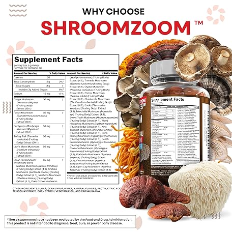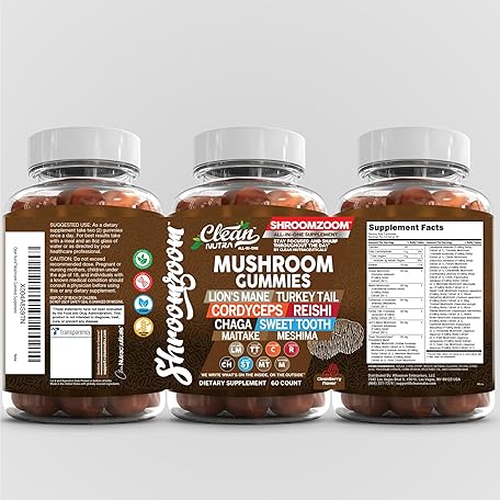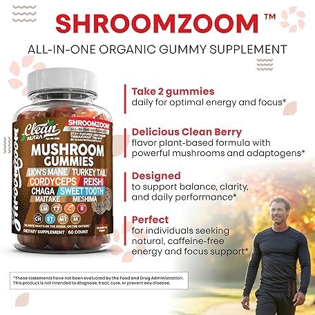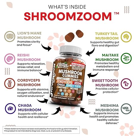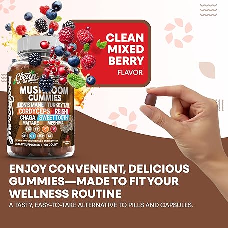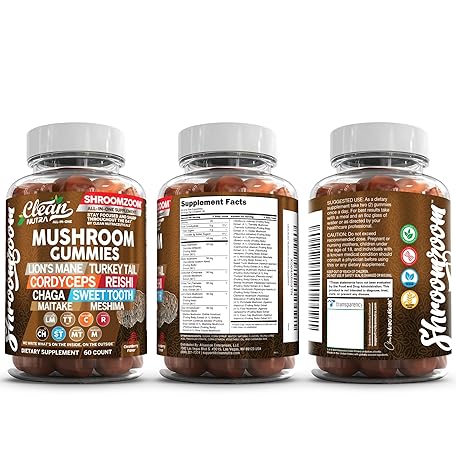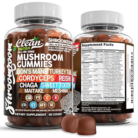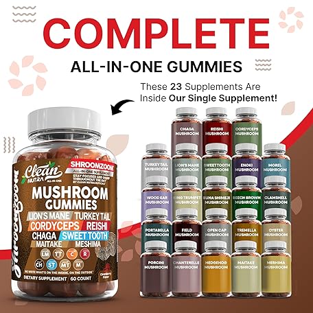Thông tin sản phẩm 15in1 Mushroom Gummies with Lion's Mane Turkey Tail Cordyceps Reishi Chaga Sweet Toot Maitake Meshima Poria Cocos Shiitake Tremella, Oyster Agaricus Mushrooms for Men and Women Supplement Clean Nutra