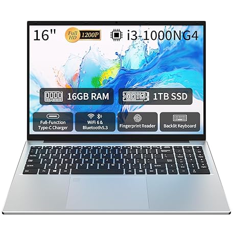 16" Traditional Laptop Computer, i3 Processor 16GB RAM 1TB SSD Silver Laptops Notebook with Backlit Keyboard, Fingerprint, WiFi 6 Bluetooth 5.3 Laptops for Students & Office USB-C Port