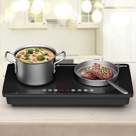 1800W Double Induction Burner, Minimal Cross-Pattern Panel, 2×900W Cooking Zones, Touch Control, 8 Power Levels, 1–99 min Timer, Durable Ceramic Glass for Magnetic Pots