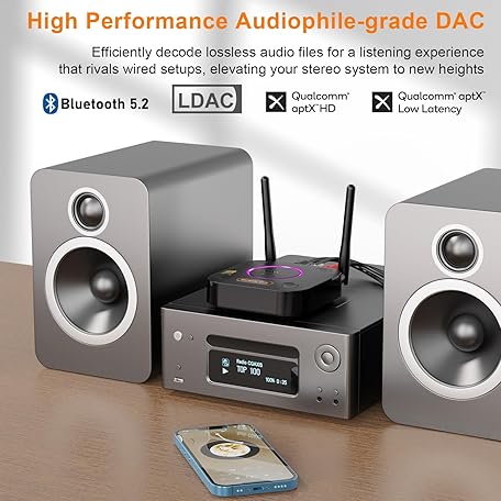 Sản phẩm 1Mii B06Ultra Bluetooth 5.2 Receiver with LDAC for Hi-Res Wireless Audio, HiFi Bluetooth Audio Adapter w/Audiophile DAC, 3D Surround aptX HD Low Latency, Optical AUX 3.5mm Coaxial for Home Stereo đang được bán với giá ưu đãi là $52.3091 tại nước Mỹ.
