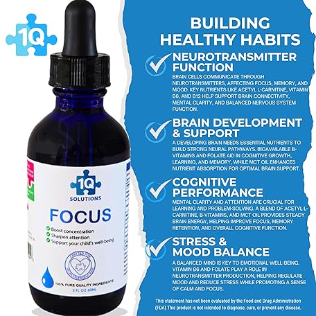 Thông tin sản phẩm 1Q Focus – Liquid Cognitive & Brain Support Drops for Kids | Acetyl L-Carnitine + B1, B6, B12 & Folate | Sugar-Free, Vegan, Non-GMO, Gluten-Free | Advanced Absorption | 2 fl oz 30 Servings