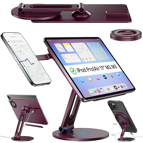 2-in-1 Magnetic Wireless Charging Stand for iPad Pro/Air 11" M2 M3 & Magnetic Phone Holder for iPhone 17-12, Foldable Aluminum Tablet Stand for iPad Pro 11" 1st/2nd/3rd/4th, Air 10.9" 4/5th