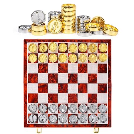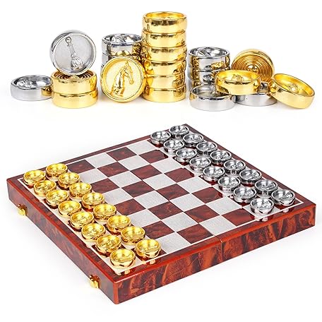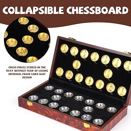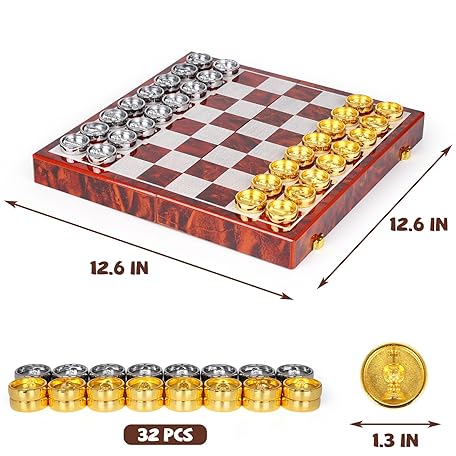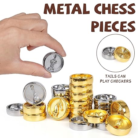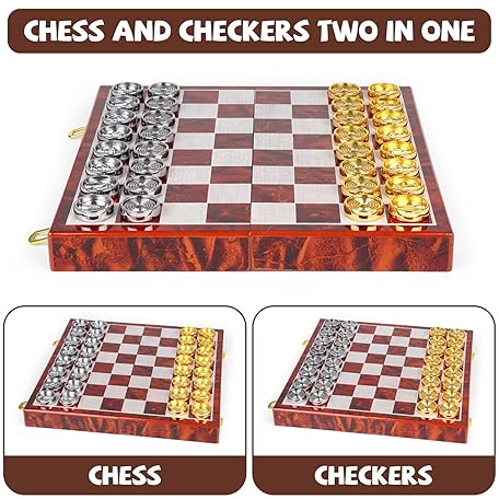 2-in-1 Metal Chess and Checkers Set for Adults & Kids –Travel Chess Sets Luxury Wooden Foldable Chessboard with Storage – Portable Classic Family Strategy Board Game with Metal Chess Pieces