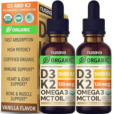 Thông tin sản phẩm (2 Pack) Organic Vitamin D3 K2 Drops with MCT Oil Omega 3, 5000 IU - Maximum Strength Vitamin D Liquid, No Fillers, Non-GMO Liquid D3 for Faster Absorption and Immune Support (Vanilla, 1 Fl OZ x 2)
