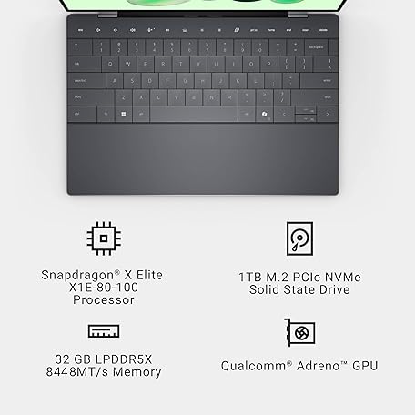 Thông tin sản phẩm 2025 Dell XPS 13 9345 Laptop, Copilot+ AI PC (13.4" FHD+ 120Hz, Qualcomm 12-Core Snapdragon X Elite, 32GB 8848MT/s RAM, 1TB SSD), Thin & Light, 27 Hours Battery Life, IR Webcam, Wi-Fi 7, Win 11 Pro