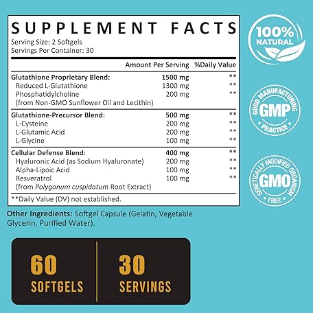 Thông tin sản phẩm 2400 MG Liposomal Glutathione Softgels, Max Absorption, Active Form L-Glutathione Reduced (GSH), with Hyaluronic Acid, Resveratrol, Master Antioxidants for Detox, Brain, Immune System, 120 Softgels