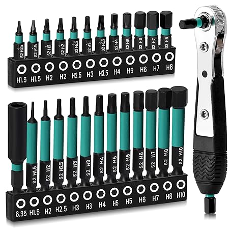 26Pcs Impact Drill Allen Key Set 25mm+60mm Long with Ratchet Screwdriver, H1.5-H10 Allen Wrench Drill Bit Set 1/4" Hex-Shank S2 Steel Metric Hex Key Driver Bits for IKEA Furniture, Narrow Space
