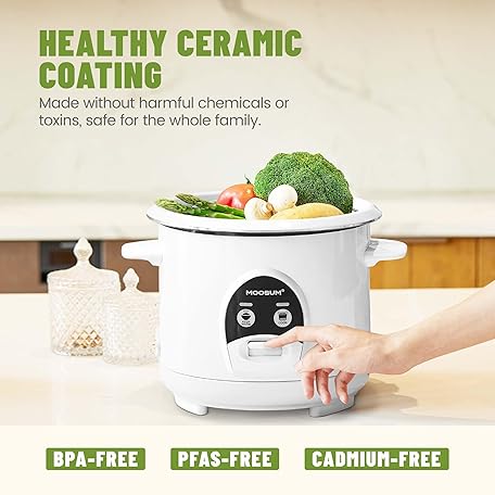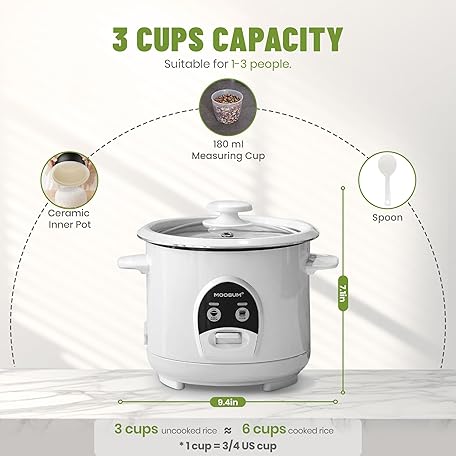 Thương hiệu Moosum là cái tên nổi tiếng được rất nhiều khách hàng trên thế giới chọn lựa. Với kiểu dáng đẹp mắt, sang trọng, sản phẩm 3-Cup Uncooked Rice Cooker Small & Food Steamer - Ceramic Coating Non-Toxic Inner Pot, One-Touch Multifunction for Rice/Sauté/Yogurt, Dishwasher Safe, 1-3 People Size, White là sự lựa chọn hoàn hảo nếu bạn đang tìm mua một món cho riêng mình.