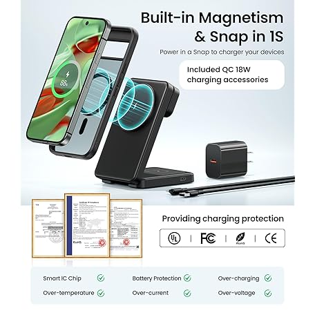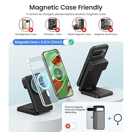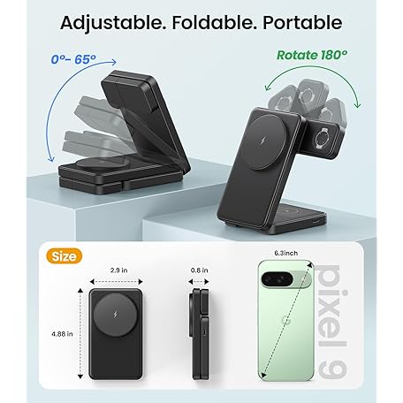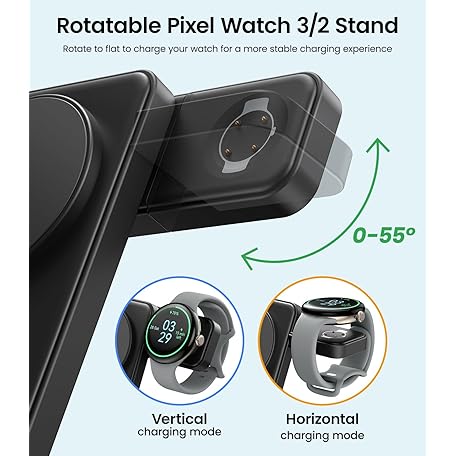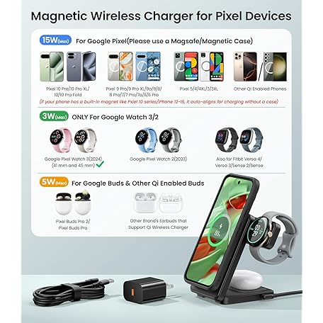 Thông tin sản phẩm 3 in 1 Magnetic Foldable Wireless Charger for Google Pixel Watch 3/2, 15W Fast Mag-Safe Charging Stand for Pixel 10 Pro XL/10 Pro Fold/10/9/8/7/6 Pro & Buds(Not Pixel Watch 4/1) with Adapter, Black