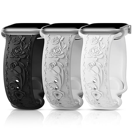 Thông tin sản phẩm 3 Packs Floral Engraved Bands Compatible with Apple Watch Band 40mm 41mm 38mm 42mm 44mm 45mm 49mm for Women, Silicone Cute Embossed Rose Apple Watch Band for iWatch Series 11 10 9 8 7 6 5 4 SE Ultra