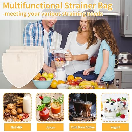 Thông tin sản phẩm 3 Pcs 12"x12" Nut Milk Bag, Natural Unbleached Cotton Cheese Cloth Bag for Straining, Reusable Strainer Bag for Oat Almond Milk, Cheese Making, Yogurt, Juice, Cold Brew Coffee, Beer Tea (12x12 Inch)