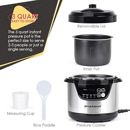Thương hiệu prepAmeal là cái tên nổi tiếng được rất nhiều khách hàng trên thế giới chọn lựa. Với kiểu dáng đẹp mắt, sang trọng, sản phẩm 3 Quart Pressure Cooker 8 IN 1 Multi Use Programmable Instant Cooker Electric Pressure Pot with Slow Cook, Rice, Steamer, Sauté, Brown, Warmer là sự lựa chọn hoàn hảo nếu bạn đang tìm mua một món cho riêng mình.