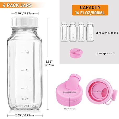 Thông tin sản phẩm 4 Pack 16 Oz Square Glass Milk Bottle with A Silicone Dispenser Cap, Glass Juice Bottles with Airtight Screw Lid, Reusable Drinking Bottles with Capacity Marks, Breastmilk Storage Container