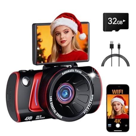 4K Digital Camera for Photography, 64MP WiFi Vlogging Camera for Beginners with 3" 180° Flip Screen, 18X Digital Zoom, Point and Shoot Cameras for YouTube with 32GB SD Card(Black)