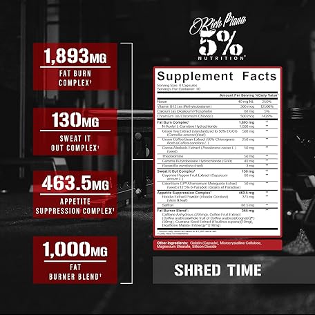 Thông tin sản phẩm 5% Nutrition Shred Time Fat Burner | Green Tea, Coffee Bean, Cayenne, Theobromine, GBB | Appetite Suppression | 30 Servings (180 Capsules)